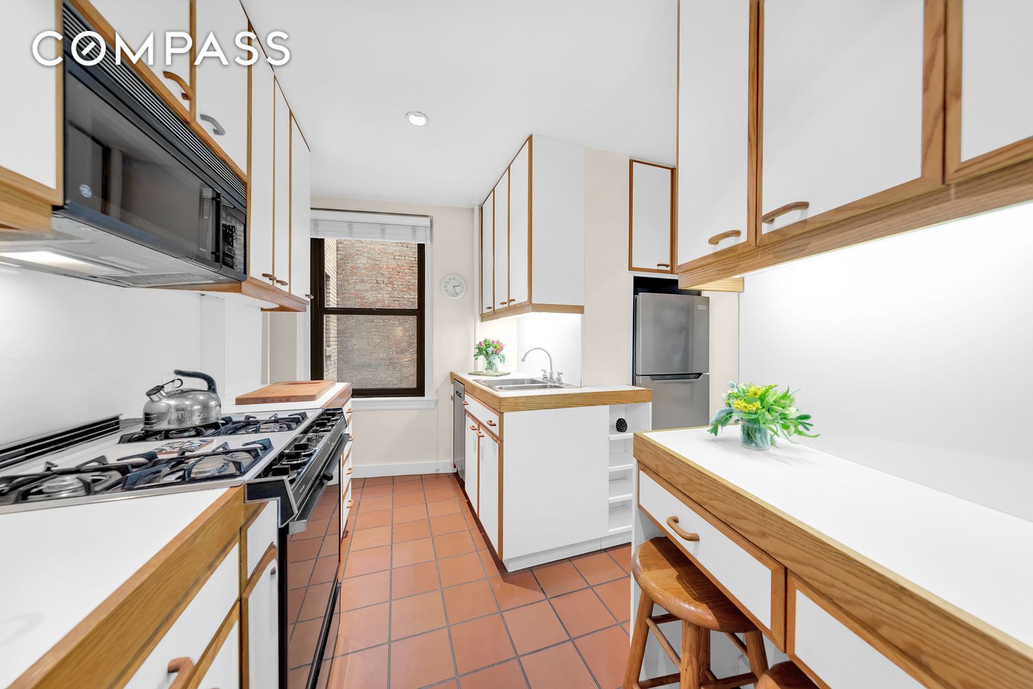 The windowed kitchen offers abundant cabinetry, and stainless steel appliances. The king-sized primary bedroom includes an en-suite bath, while the secondary bedroom also enjoys the privacy of its own en-suite bathroom.