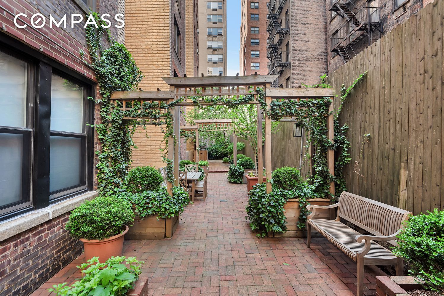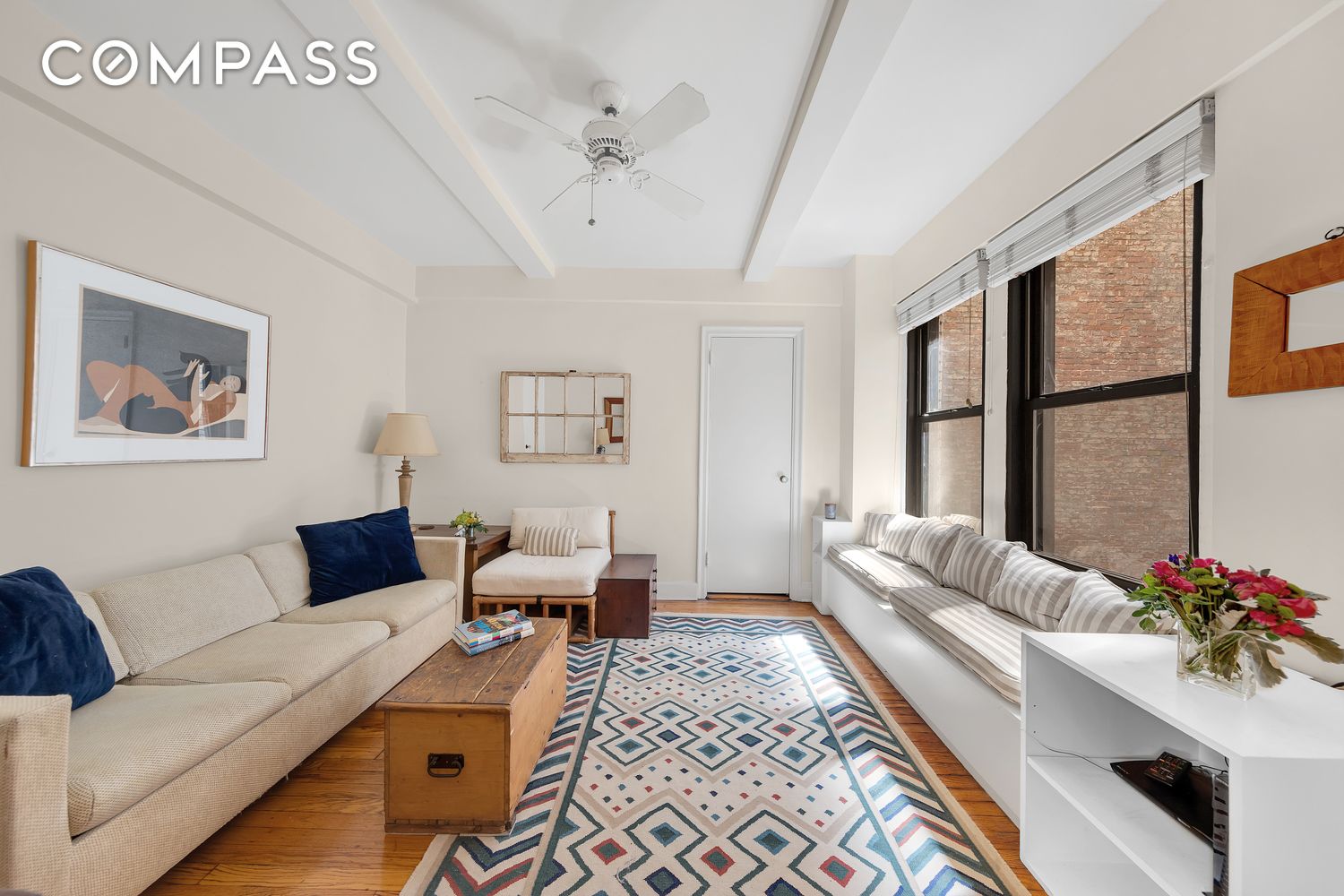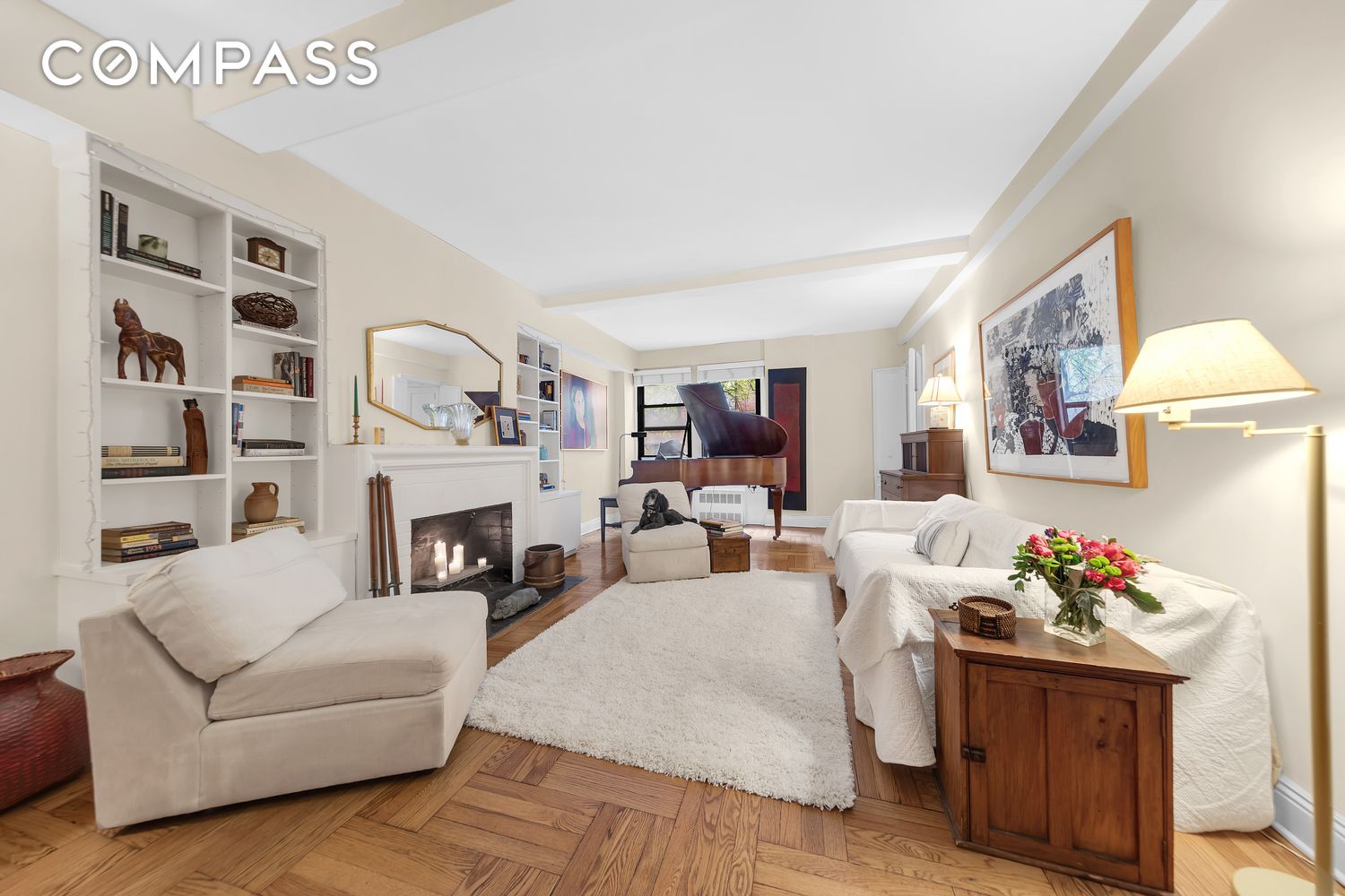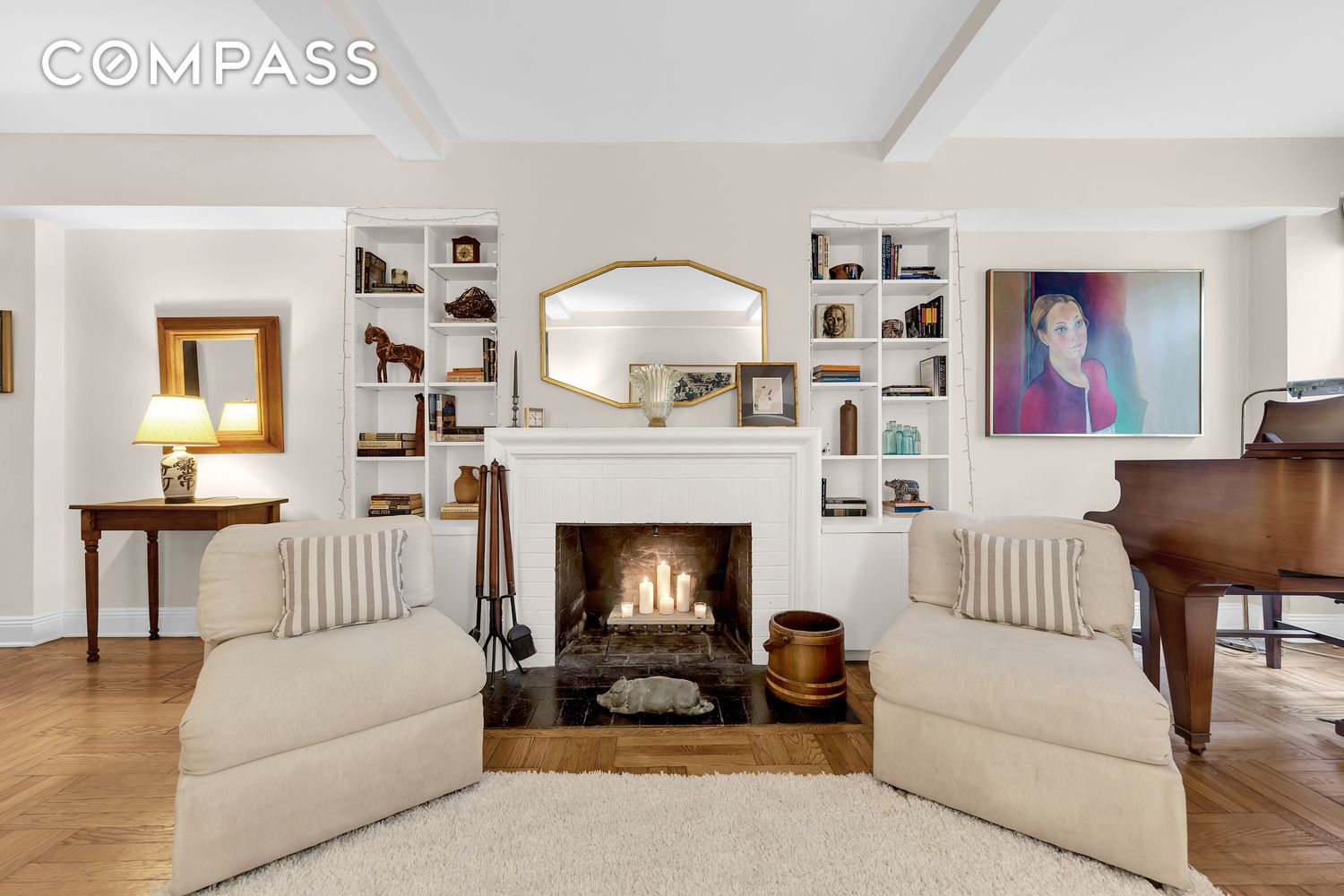 Featuring a wood-burning fireplace, high ceilings, and hardwood floors throughout, the residence is filled with character. North-facing windows overlook the building's private landscaped courtyard--a serene space with multiple seating areas just steps from your door. The spacious living room easily accommodates both a dining area and a baby grand piano.