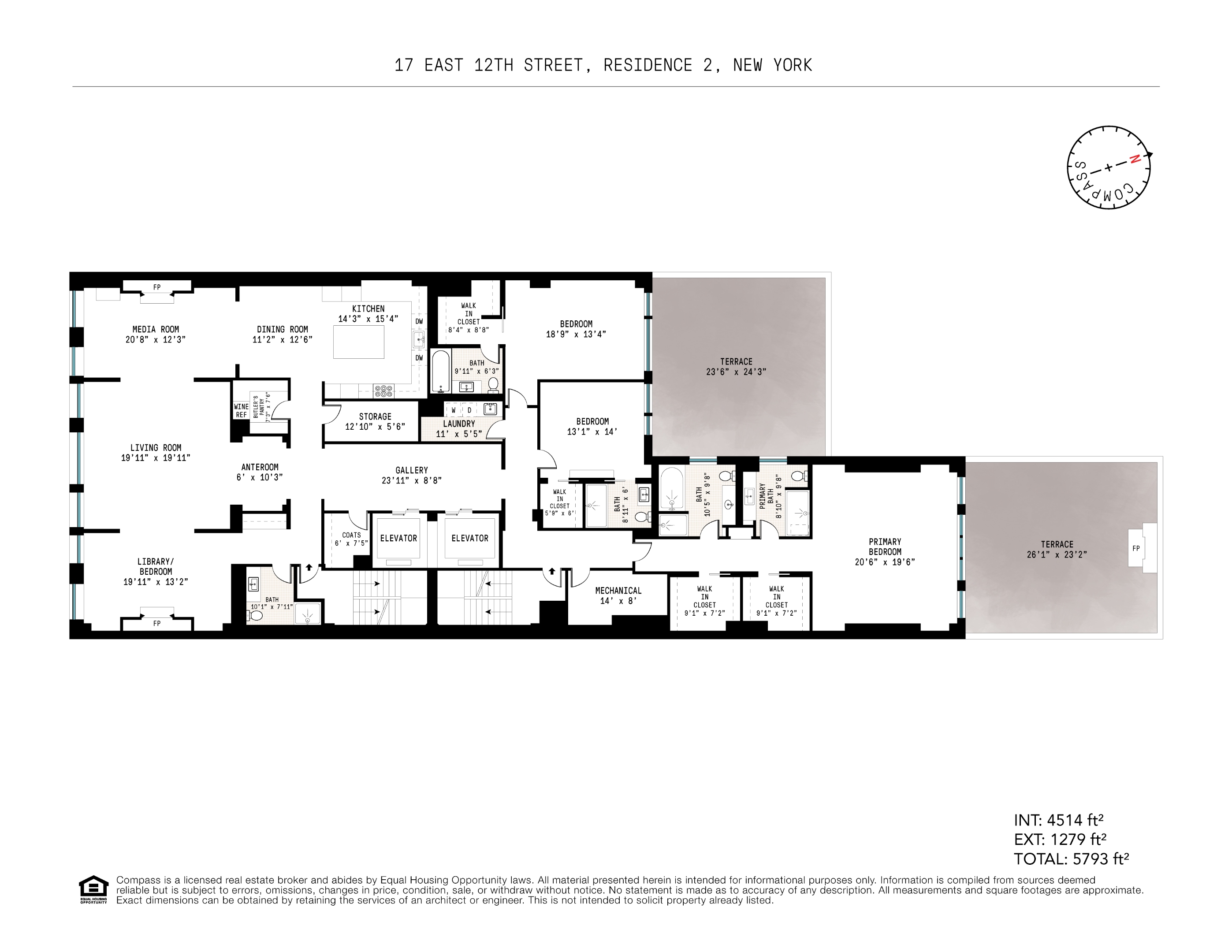 Two additional bedrooms each feature ensuite bathrooms, walk-in closets, and access to a second terrace of 574 square feet.