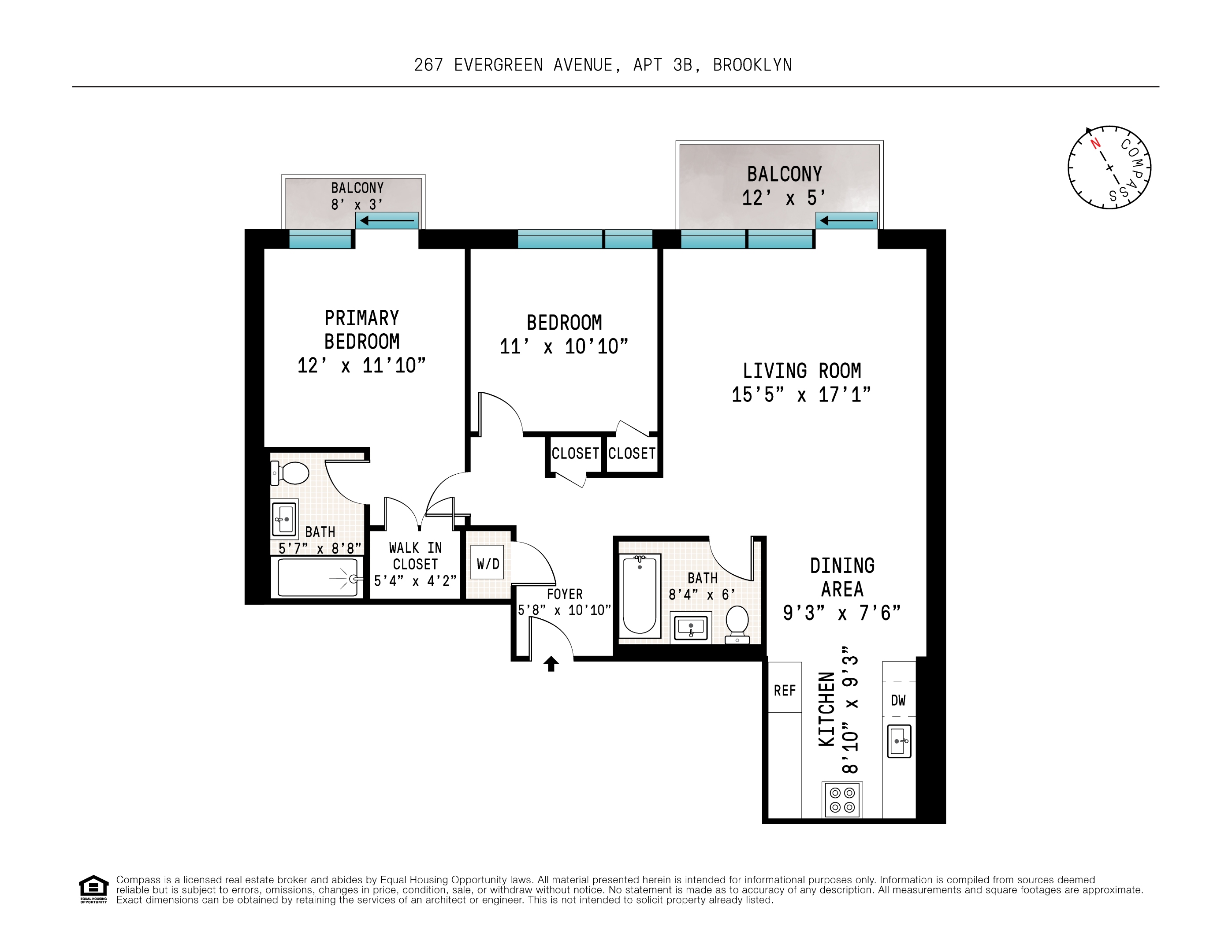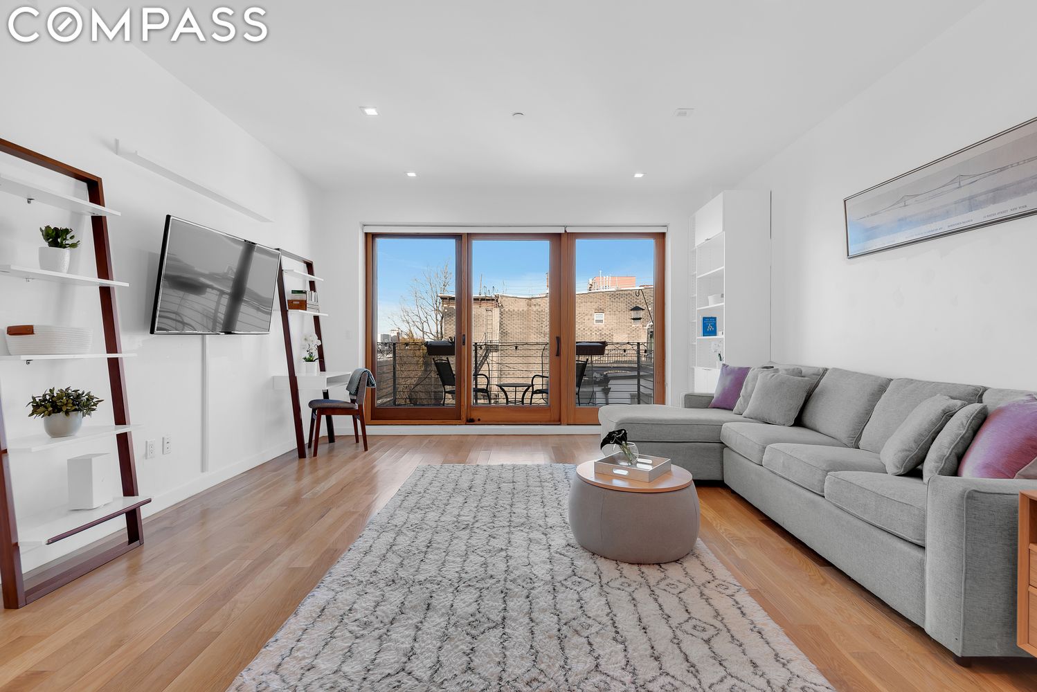 Off of the foyer is a coat closet and the washer and dryer. To the west the primary bedroom has a large walk-in closet and an ensuite bathroom, room enough for a king bed and a desk. There is an additional private balcony off of the primary watch sunsets over Bushwick and further Manhattan. Each bathroom has radiant heated floors and the apartment has central heat and air conditioning. Additionally the unit transfers with a private 50 square ft storage room in the building basement.