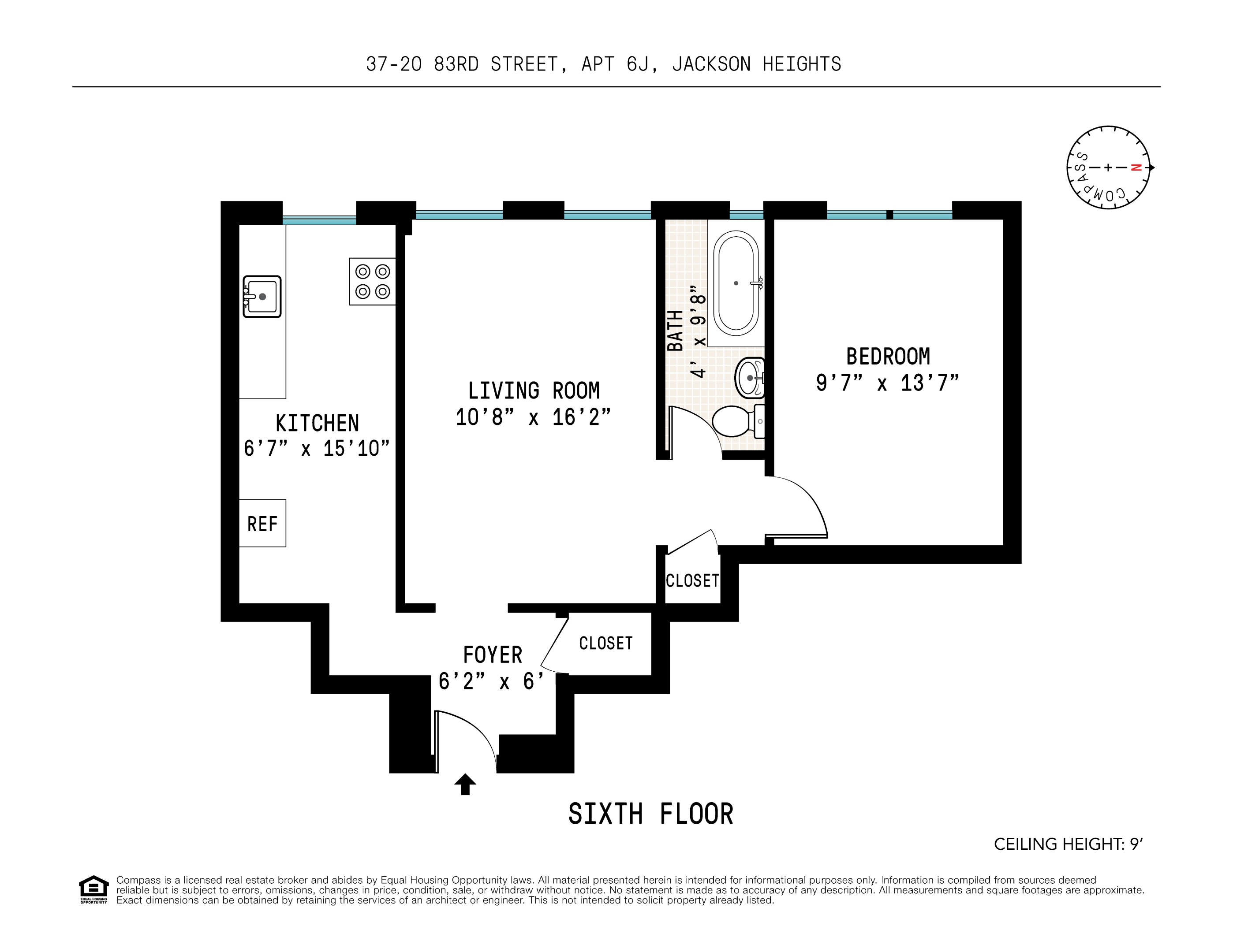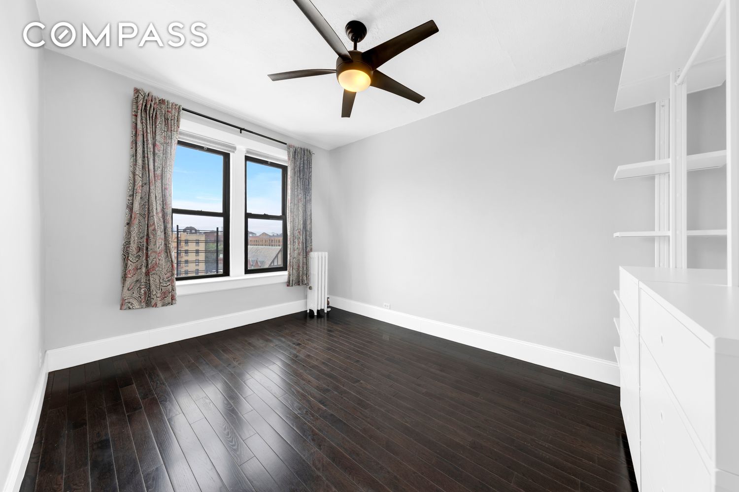 Welcome to Residence 6J, a bright and thoughtfully laid-out one-bedroom home perched on the top floor of a well-maintained elevator building. With western exposure, the apartment enjoys incredible natural light and open views safeguarded by the Jackson Heights Historic District. The living room is generously sized and easily accommodates both a work-from-home setup and a large L-shaped sofa, while the windowed eat-in kitchen provides ample storage and space for dining. The windowed bathroom enhances the home's airy feel, and the bedroom features a custom wardrobe storage system. Updated dark-stained hardwood floors run throughout, adding warmth and continuity.