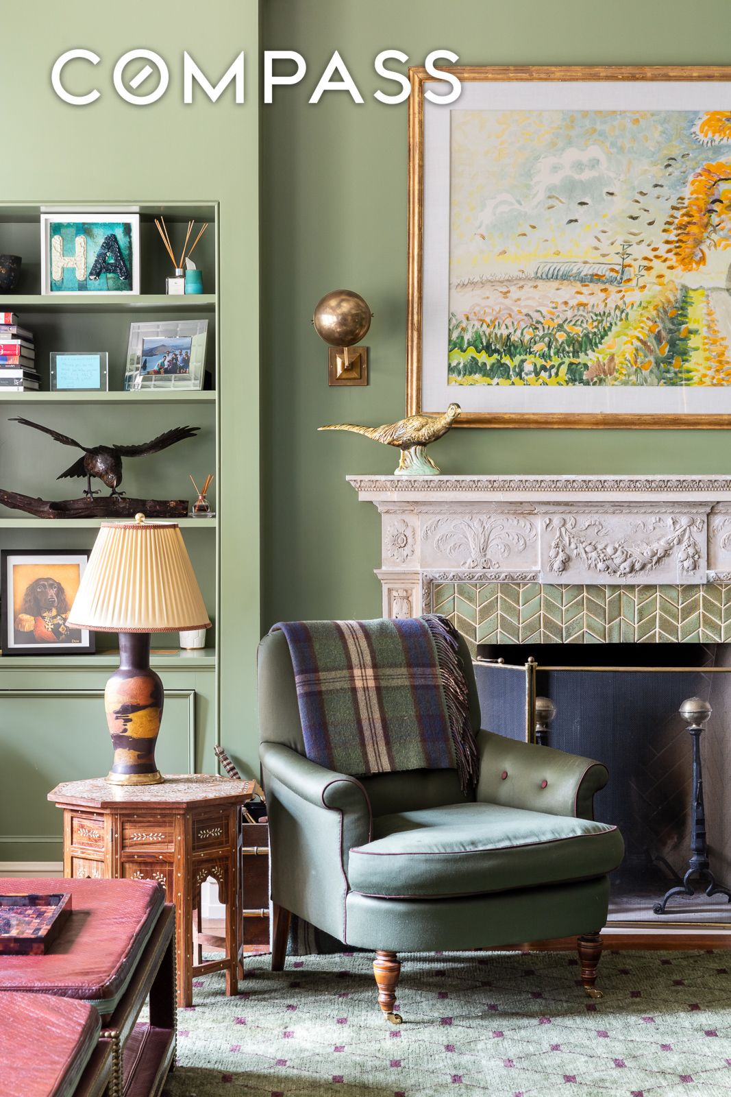Every detail has been thoughtfully curated, from custom-made stained glass in the library to hand-painted Japanese wallpaper in the hallways. The warm ambiance is further enhanced by wall upholstery and unique custom tiles adorning each of the six wood-burning fireplaces.